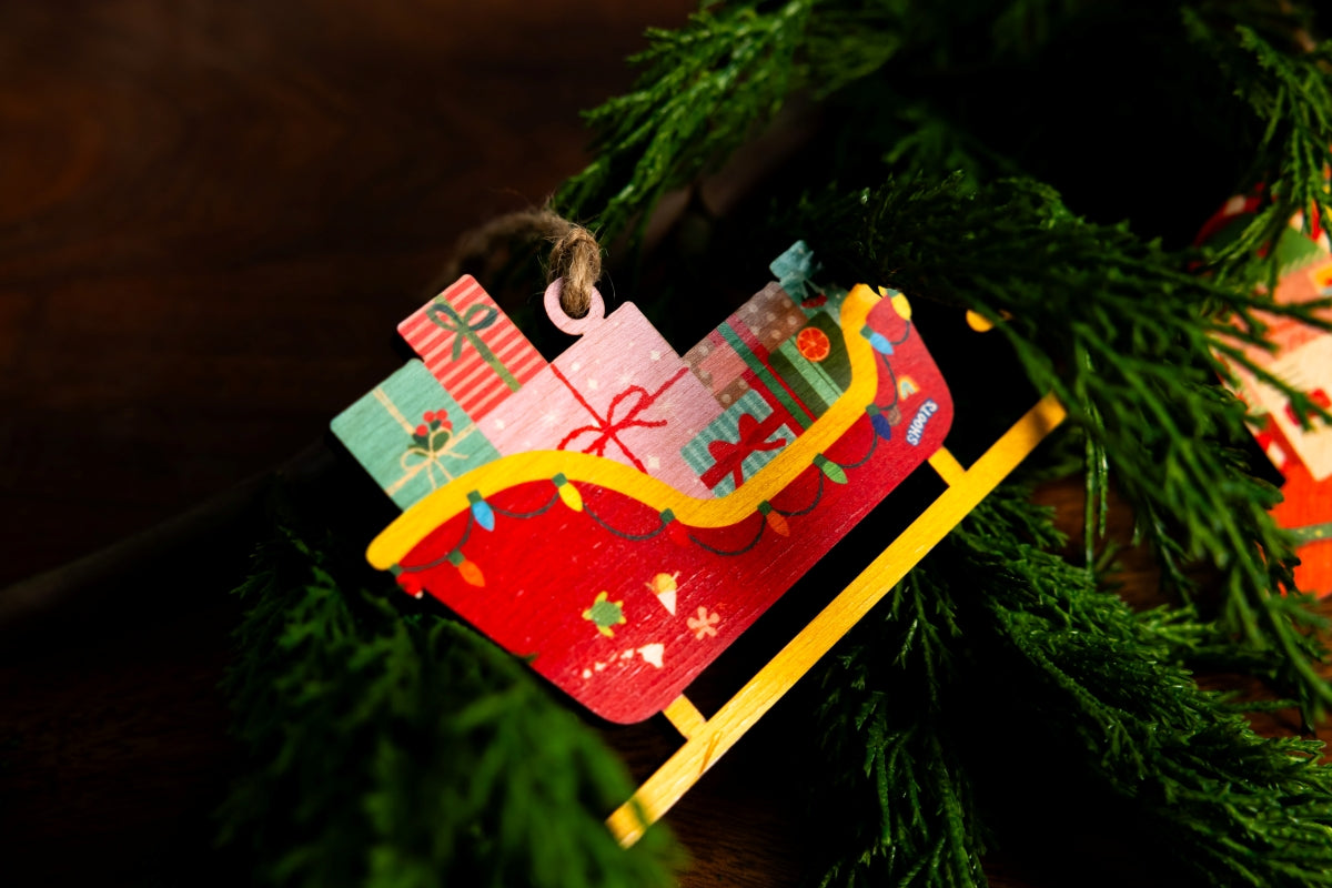 The CocoVille Sleigh Ornament is bursting with holiday cheer! This bright red sleigh, filled with colorful wrapped gifts and strung with twinkling lights, brings the magic of Christmas to your tree with a touch of island warmth. A perfect keepsake or gift to share the joy of the season. Created by local CocoNene designers. Made in Hawaiʻi, made with aloha.