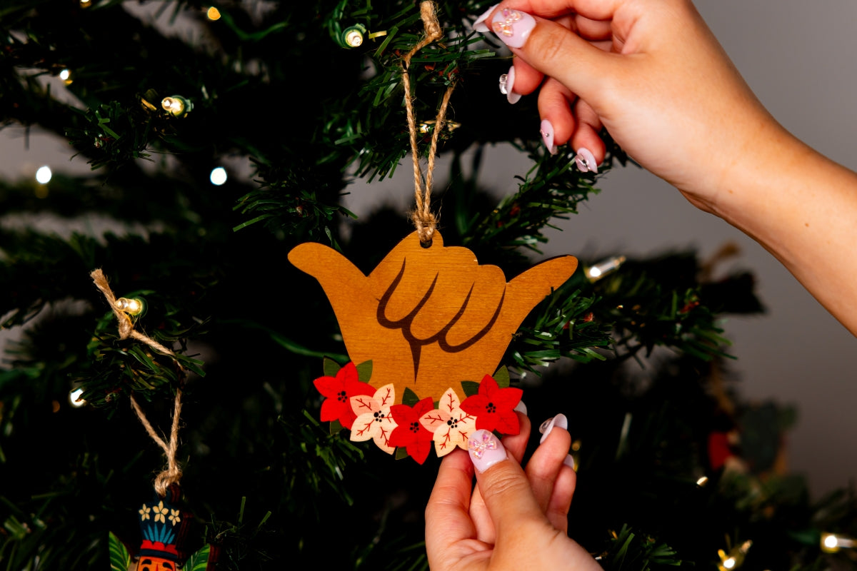 Share the spirit of aloha this season with our Shaka Kupeʻe Ornament! Featuring Hawai‘i’s iconic shaka hand surrounded by festive red and white poinsettias, this ornament blends island style with holiday cheer. A fun keepsake or gift that spreads good vibes and Mele Kalikimaka wherever it hangs. Designed by local CocoNene artists — Made in Hawai‘i, made with aloha.