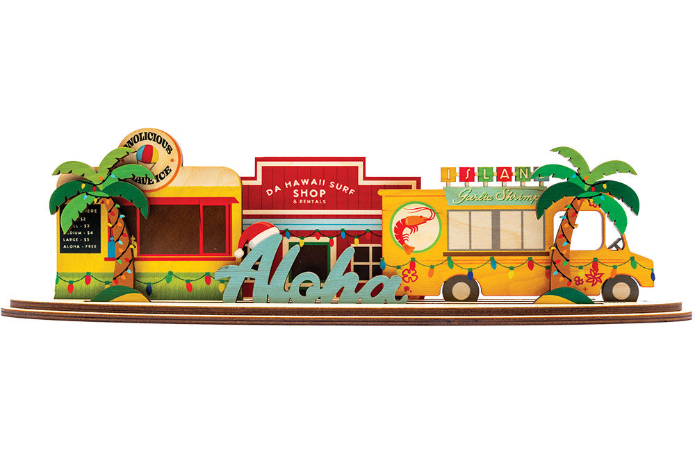 Bring a bit of Hawai‘i’s local charm to your holiday décor with the CocoVille Mele Marketplace Gun Set. This festive, handcrafted tabletop display captures the spirit of island life during the holidays — complete with a shave ice stand, surf shop, and shrimp truck strung with twinkling Christmas lights. Whether you’ve strolled through a real marketplace on O‘ahu’s North Shore or simply love the island vibe, this piece instantly transports you there. From the surfboards to the palm trees wrapped in lights, every detail celebrates the joy of a Hawaiian Christmas. Created by local CocoNene designers. Made in Hawai‘i, made with aloha.