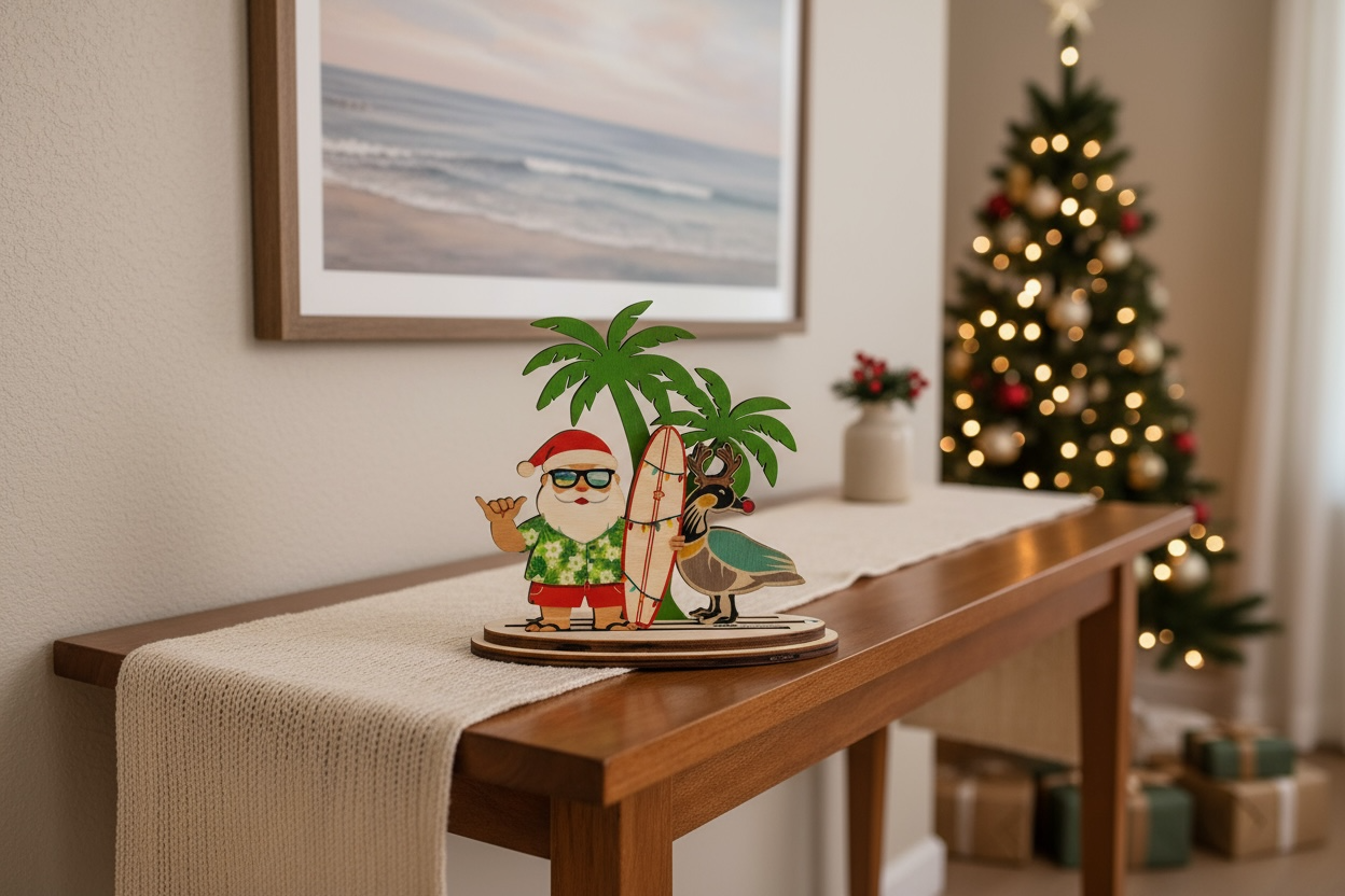 Decorative Santa Claus figurine with a surfboard and nene goose on a wooden table with a Christmas tree in the background.