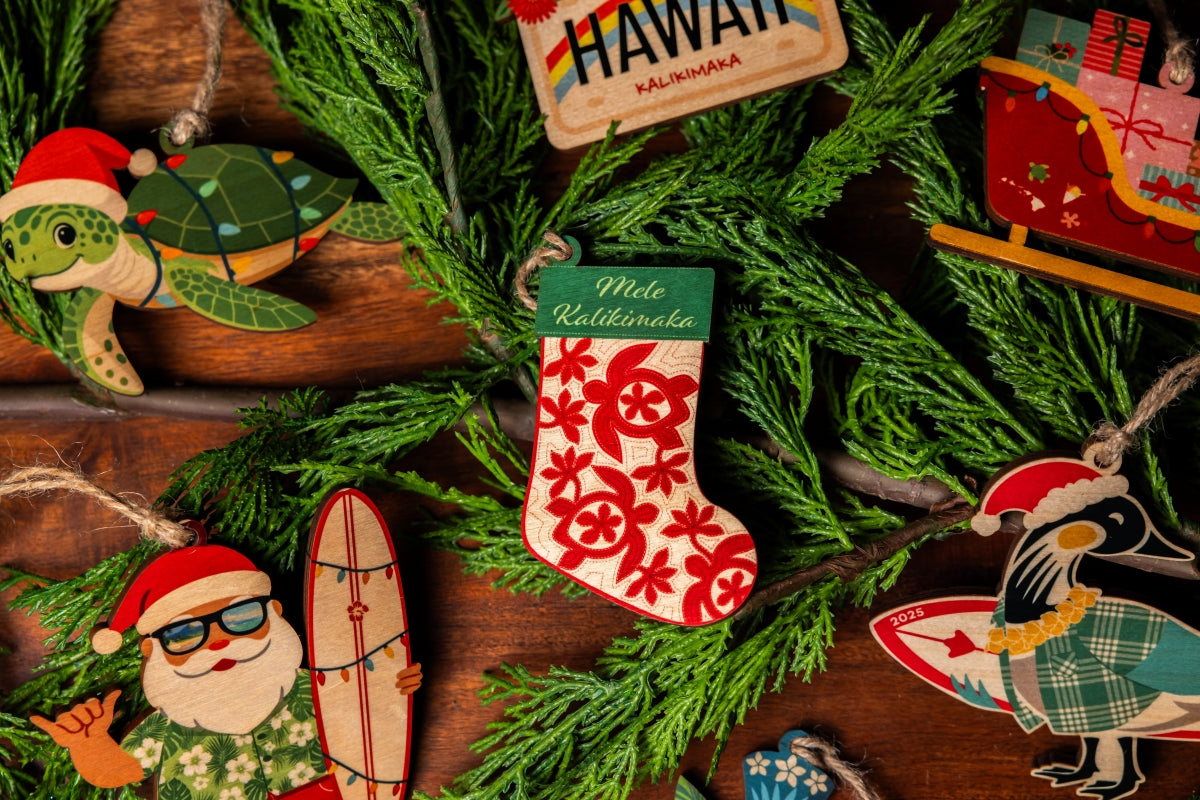 Celebrate Mele Kalikimaka with our Hawaiian Quilt Stocking Ornament! Inspired by traditional Hawaiian quilt patterns, this ornament features red honu (sea turtles) and floral designs stitched in festive island style. A timeless keepsake that blends holiday cheer with Hawai‘i’s rich cultural heritage — perfect for your tree or as a thoughtful gift. Designed by local CocoNene artists — Made in Hawai‘i, made with aloha.